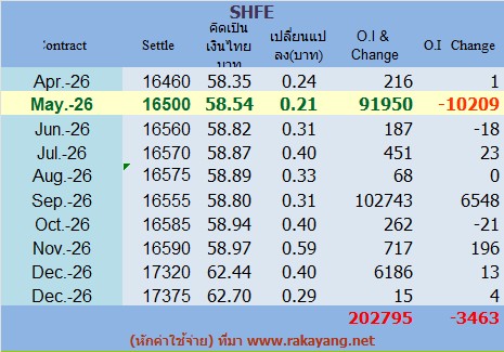 เทียบจากราคา(Settle)คิดเป็นเงินไทย(หักค่าใช้จ่าย)58.54บาท/กก. ราคาเพิ่มขึ้น 0.21บาท/กก.