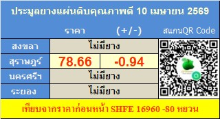 ส่วนราคาเฉลี่ยยางแผ่นดิบคุณภาพดีวันนี้ 78.66 บาท/กก. ราคาเฉลี่ยเพิ่มขึ้น 4.96 บาท/กก. จากวันก่อนหน้านี้