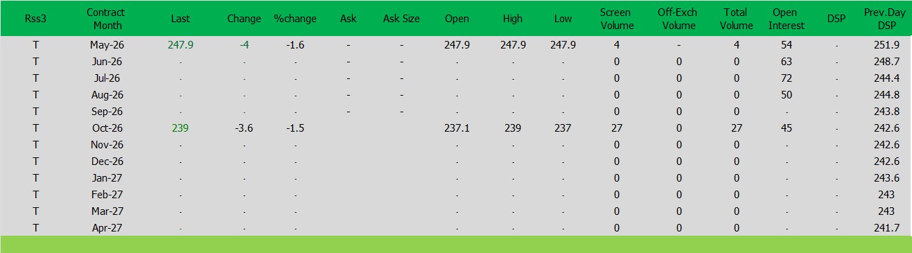 ราคาปิดตลาดยาง SICOMประจำวัน ศุกร์ ที่ 10เมษายน2569ราคายาง RSS3 ราคาเดือนพ.ค. ราคาลดลง -4เซนต์สหรัฐ ปิดที่ 247.9 เซนต์สหรัฐ