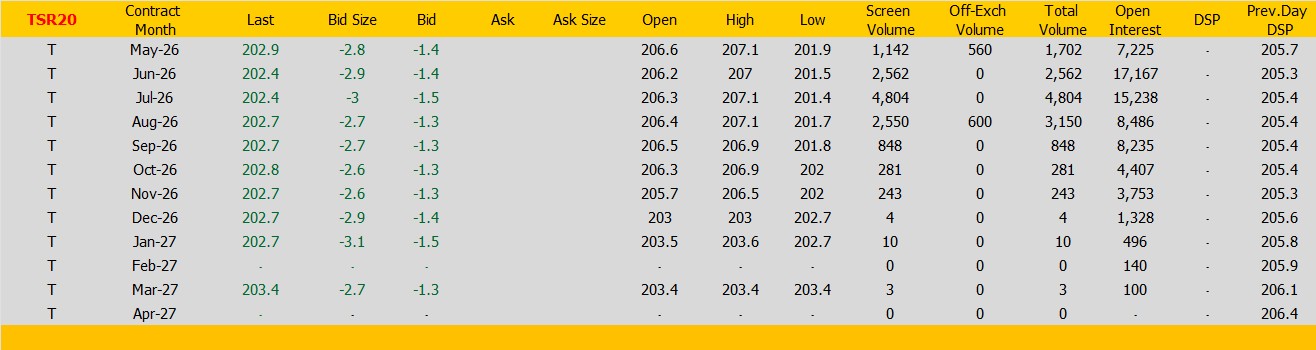 ราคายางTSR20 ตลาดยางSICOM ราคาส่งมอบเดือน พ.ค.ปิดที่202.9 เซนต์สหรัฐ  ราคาลดลง -2.8 เซนต์สหรัฐหรือ คิดเป็นเปอร์เซนต์ -1.36% %
